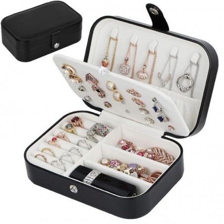يعتبر صندوق تنظيم المجوهرات الأسود الأنيق الحل المثالي لتخزين جميع قطعك الثمينة. مع أقسام مخصصة للخواتم، والأقراط، والقلائد، يضمن هذا الصندوق أن تظل مجوهراتك مرتبة ومرتبة. يوفر البطانة الداخلية الناعمة وسادة لطيفة لحماية مقتنياتك من الخدوش والأضرار. صغير وأنيق، إنه مثالي للتخزين المنزلي والسفر. تضمن إغلاق القفل الآمن أن كنوزك في أمان، مما يجعله ملحقًا لا بد منه لأي محب للمجوهرات.