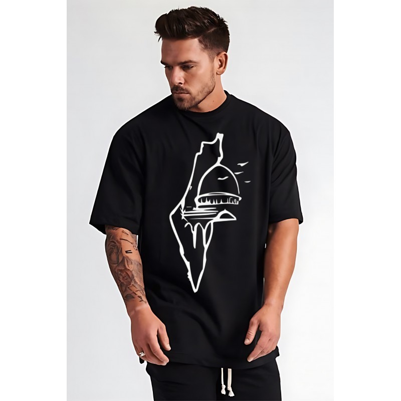 اللون الأسود اللافت يوفر تنوعاً، مما يتيح لك تنسيقه بسهولة مع الجينز أو الشورتات أو السراويل الرياضية. الميزة البارزة هي التصميم الجرافيكي الفريد على المقدمة - خريطة مفصلة لفلسطين مزينة بهيكل قبة أيقوني. هذه التمثيل الفني لا يضيف فقط لمسة جمالية بل يحتفل أيضاً بالهوية الثقافية.