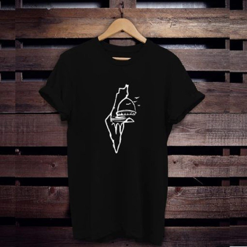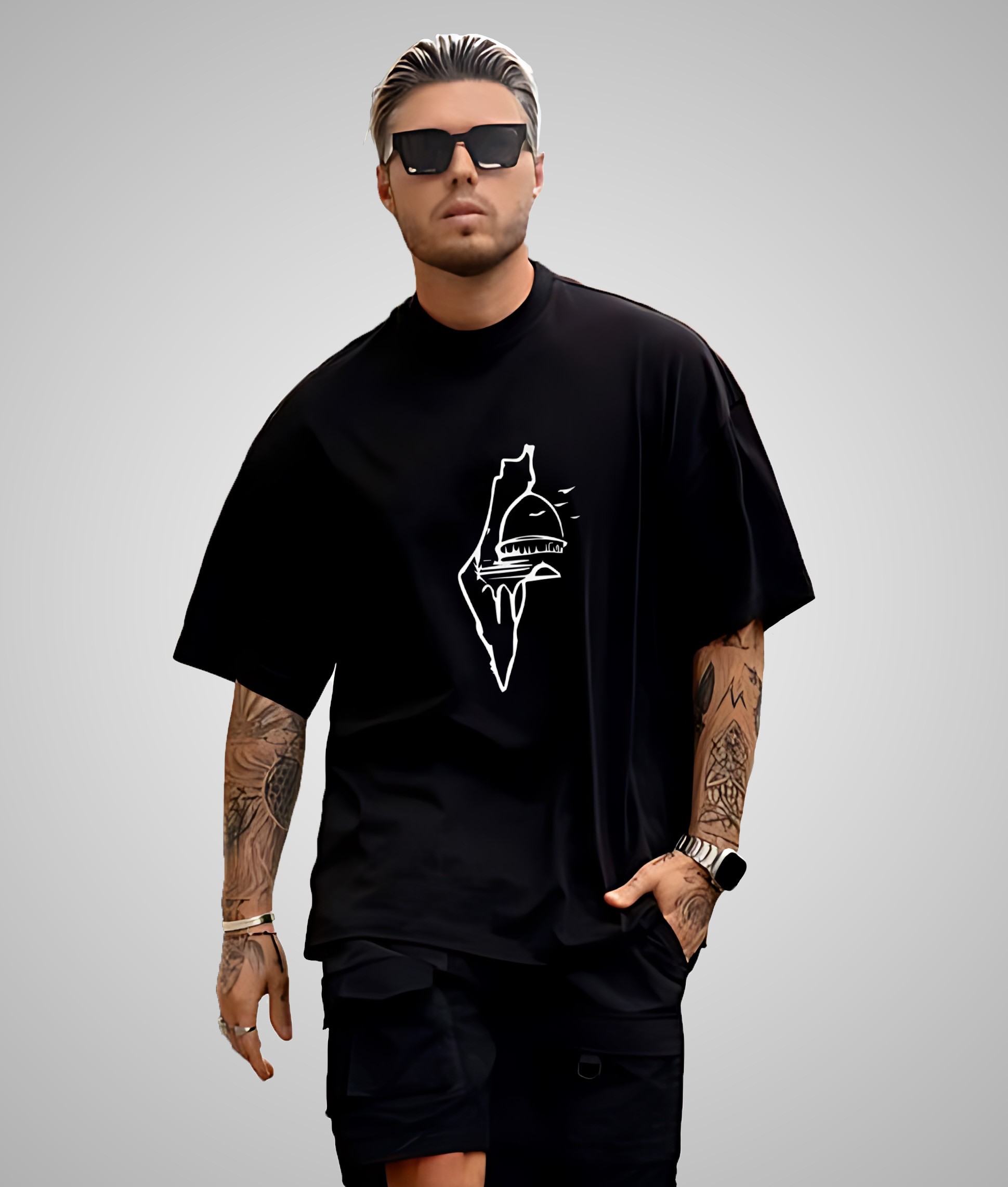 اللون الأسود اللافت يوفر تنوعاً، مما يتيح لك تنسيقه بسهولة مع الجينز أو الشورتات أو السراويل الرياضية. الميزة البارزة هي التصميم الجرافيكي الفريد على المقدمة - خريطة مفصلة لفلسطين مزينة بهيكل قبة أيقوني. هذه التمثيل الفني لا يضيف فقط لمسة جمالية بل يحتفل أيضاً بالهوية الثقافية.