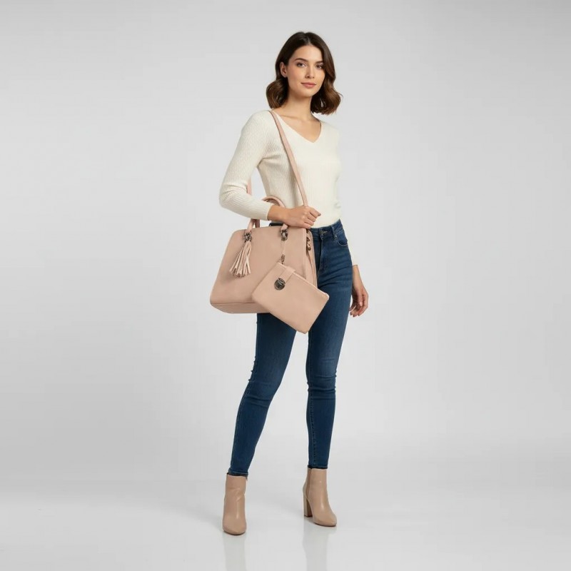 حقيبة يد بيج أنيقة مع حقيبة مطابقة