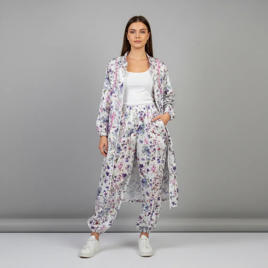 يقدم هذا الطقم المزخرف بالزهور راحة وأناقة، مثالي للاسترخاء في المنزل أو الخروج غير الرسمي. مصنوع من قماش ناعم وقابل للتنفس، يضمن ملاءمة مريحة مع إضافة لمسة من الأناقة لخزانتك.