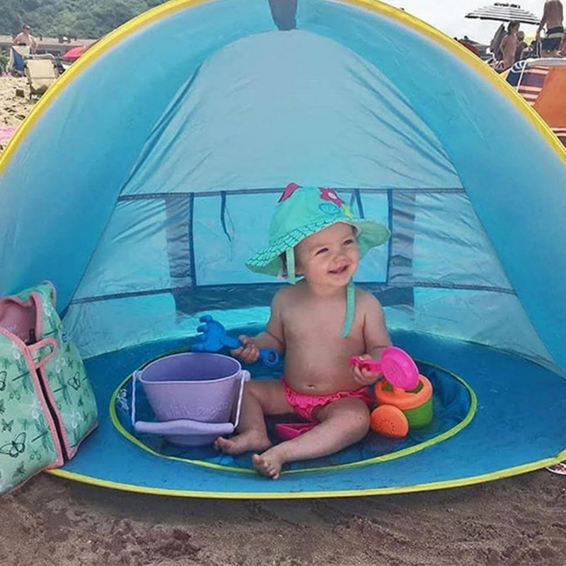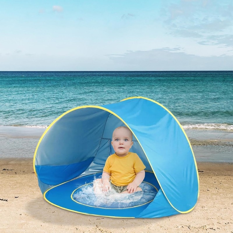 A standout feature of this product is its built-in pool area, perfect for keeping children entertained while staying cool. The waterproof floor design allows you to fill it with water safely, creating a mini oasis right at the beach. Additionally, this portable tent is collapsible and comes with a convenient carrying bag for easy transport.