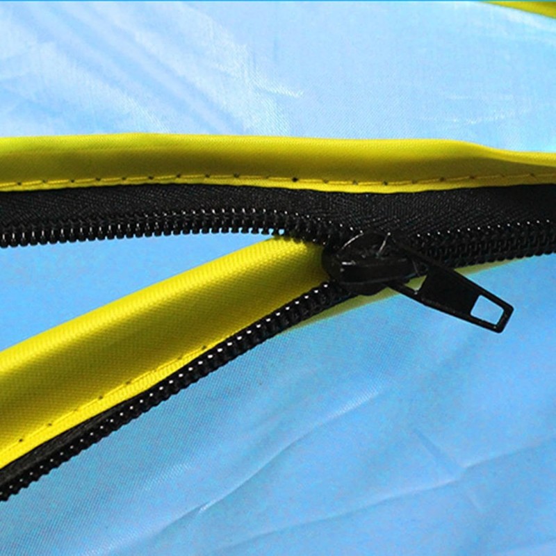 The tent features a spacious semi-circular dome shape, providing ample headroom and comfort for relaxation. With its vibrant blue color accented by yellow trim, this beach tent not only stands out but also enhances visibility on sunny days. Constructed from lightweight yet durable polyester blend fabric, it is built to withstand wear and tear while offering excellent UV protection. You can confidently spend hours under its shade without worrying about harmful rays.