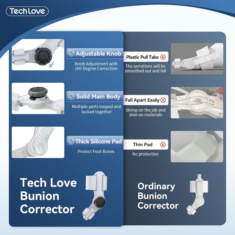 The adjustable knob allows for a remarkable 160-degree adjustment, enabling users to find their perfect fit. This personalized alignment not only enhances comfort but also promotes effective correction of the big toe's position. Unlike ordinary bunion correctors that may lack durability, the Tech Love model boasts a solid main body, constructed from high-quality materials that ensure stability and longevity.