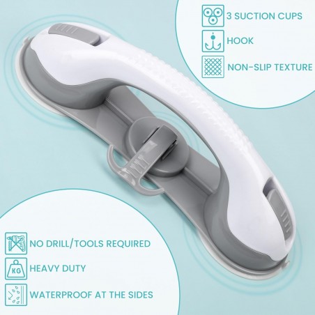 Equipped with three large suction cups, the grab bar adheres securely to smooth surfaces such as tiles or glass. This innovative suction mechanism allows for quick installation without the need for drilling or tools—simply press firmly against a clean surface and engage the locking mechanism. The non-slip texture on the handle further enhances safety by preventing accidental slips during use.