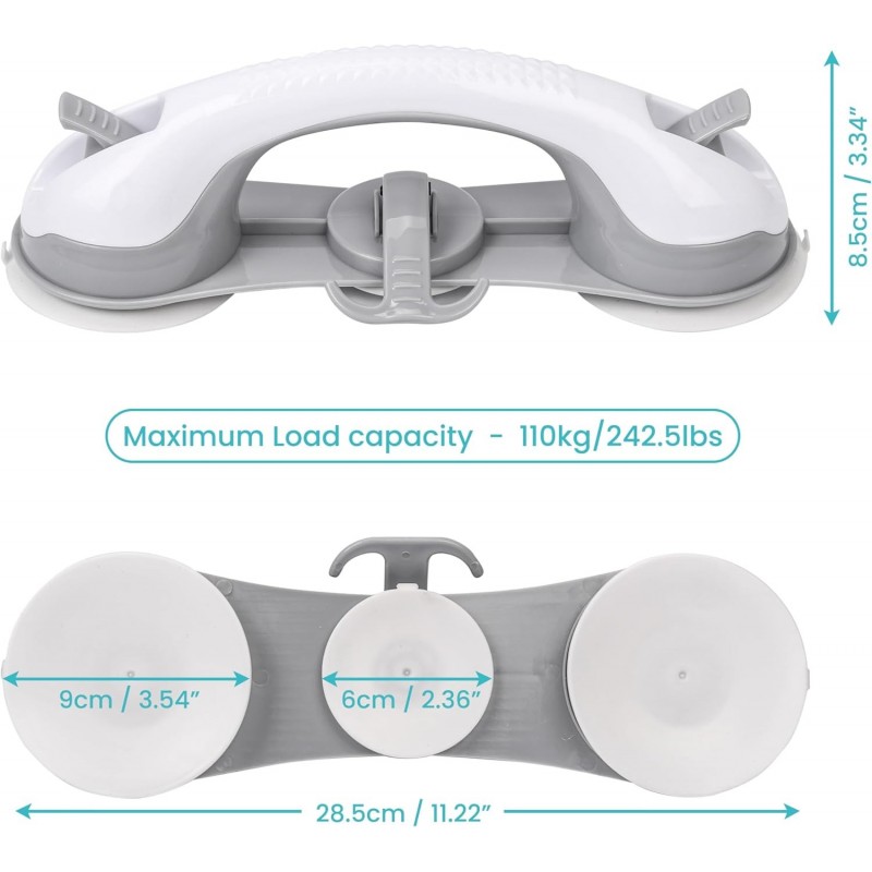 The grab bar features a sleek combination of white and gray tones, allowing it to seamlessly blend into any bathroom decor. Its ergonomic design includes a curved handle that ensures a comfortable grip for users of all hand sizes. Constructed from durable plastic, this grab bar is not only water-resistant but also easy to clean, making it perfect for wet environments.