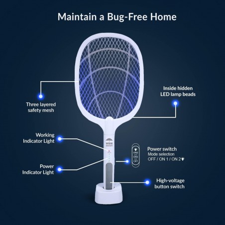 Equipped with a three-layered safety mesh, this device prioritizes user safety by preventing accidental contact with the high-voltage grid. The hidden LED lamp beads attract insects efficiently, enhancing its effectiveness as both a trap lamp and swatter. You can easily monitor its operation through the power and working indicator lights.