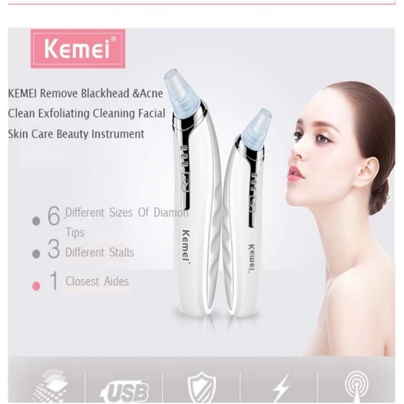 The Kemei Blackhead Cleaning Apparatus offers a gentle yet effective solution for removing blackheads and cleaning pores. Featuring USB charging, it's convenient and easy to use. Its design ensures it doesn't hurt the skin while effectively absorbing blackheads.
