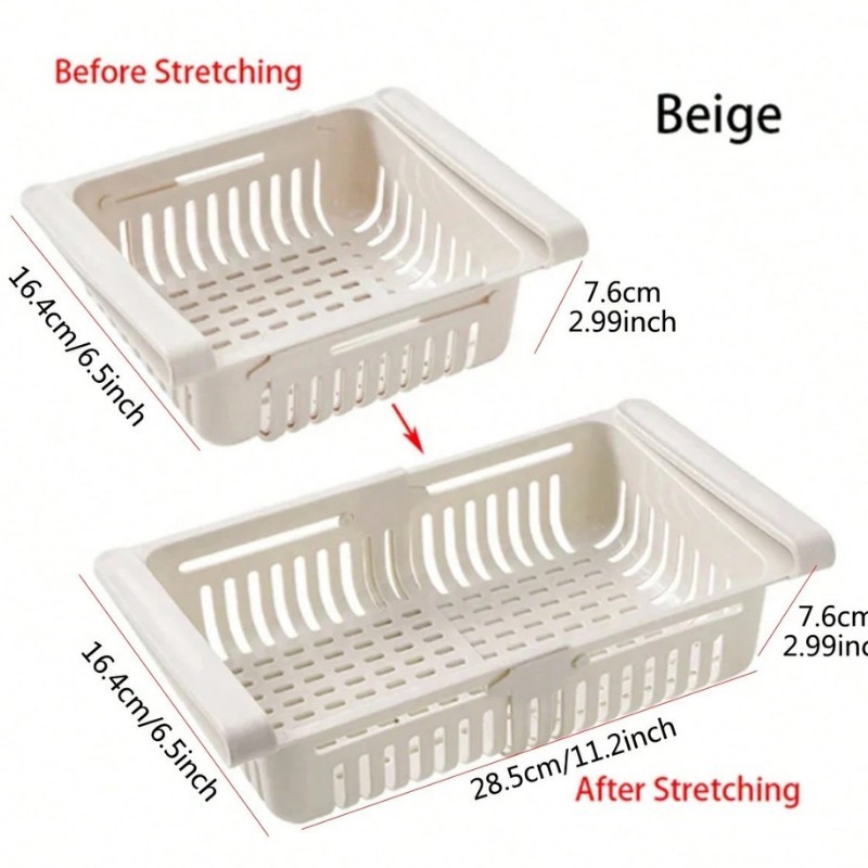 This adjustable refrigerator storage basket is designed to optimize space in your fridge. Made from durable plastic, it can easily be expanded to fit various shelf sizes. Ideal for organizing fruits, vegetables, and other small items, keeping your fridge neat and tidy.