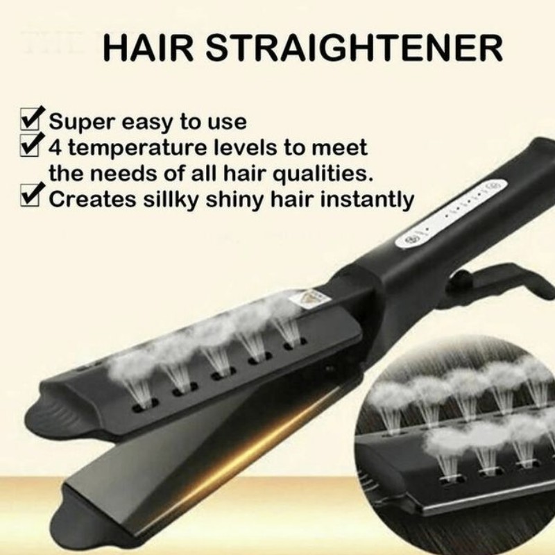 This professional hair straightener offers a widened panel for efficient styling, rapid heating in just 15 seconds, and four adjustable temperature settings to suit all hair types. Designed for both dry and wet hair, it provides a tight fitting with a scissors handle for easy use.