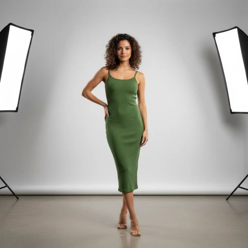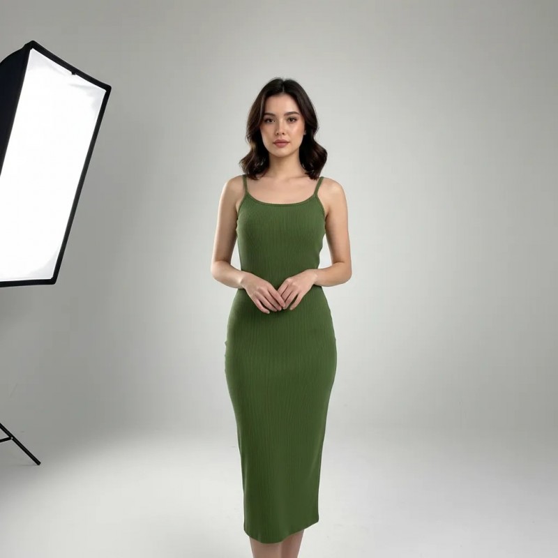 Robe Midi Élegante Vert Olive à Côtes